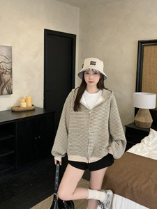 大码胖MM秋季美式复古慵懒风宽松条纹开衫连帽休闲长袖外套