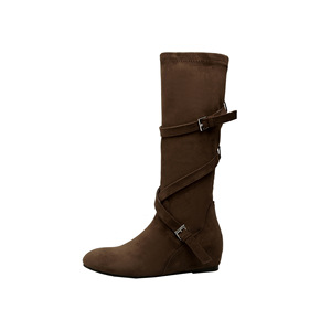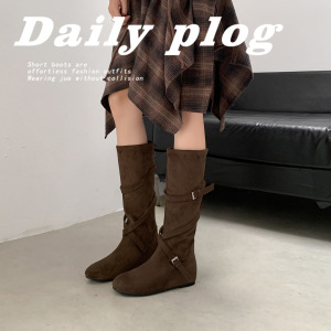 葡萄妈同款增高6cm~韩系圆头百搭扣带柔软褶皱显瘦厚底中高筒靴女
