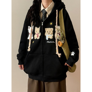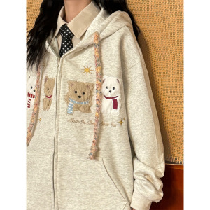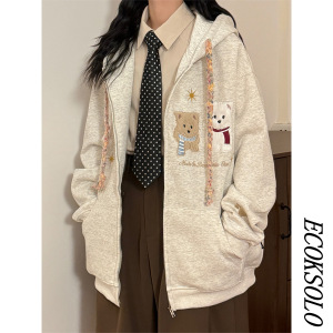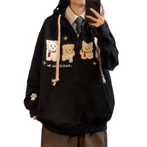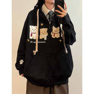 ECOKSOLO秋季日系趣味可爱植绒小狗刺绣抽绳连帽开衫拉链卫衣外套
