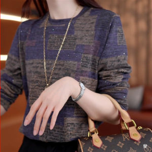 一件代发原版面料2025秋季款时尚圆领闪银长袖复古印花打底衫上衣