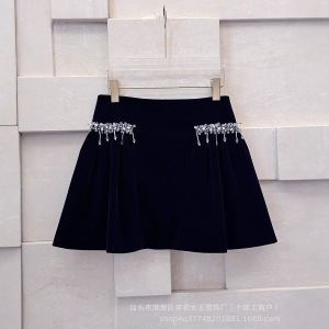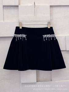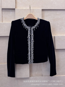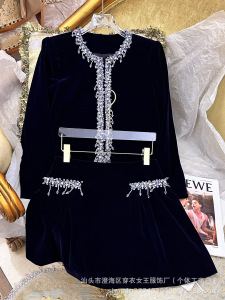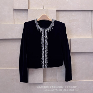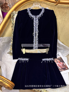 黑蓝色手钉珠丝绒泡泡袖外套少女新款法式气质千金时尚套装小香风