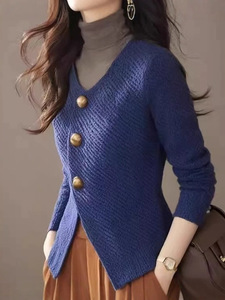 时尚高级感2025年新款冬季女士装法式设计硫酸铜蓝V领长袖针织衫