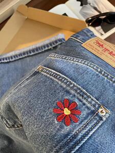 型爆好!人手一条,复古水洗小红花刺绣直筒显瘦牛仔裤女G091312