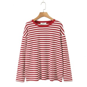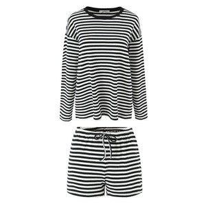 慵懒风圆领长袖宽松撞色条纹T恤+高腰抽绳直筒休闲短裤 两件套装