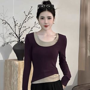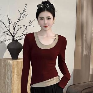 德绒撞色假两件长袖打底衫女早秋季修身显瘦洋气小众上衣外穿潮