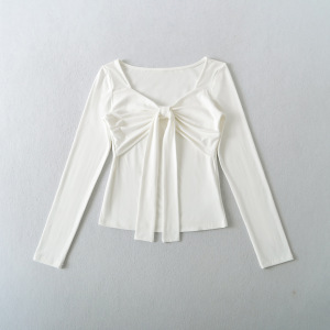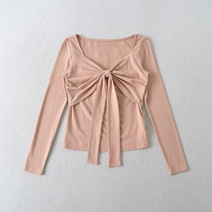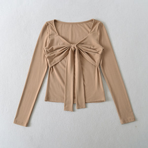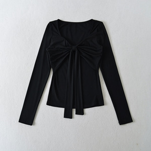 2535-25秋款纯欲修身款v领胸前蝴蝶结长袖T恤女打底衫内搭T恤上衣