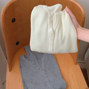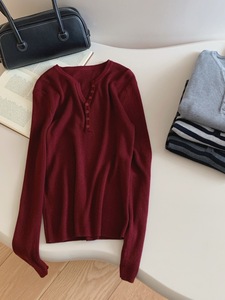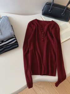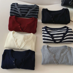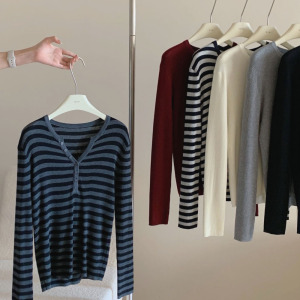 2025早秋V领一排扣长袖针织打底衫显瘦内搭薄款条纹毛衣女上衣女