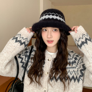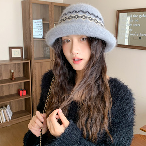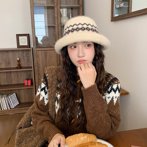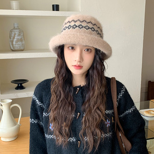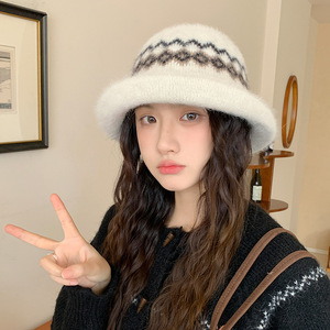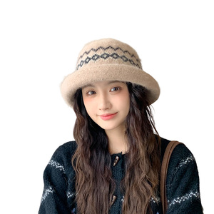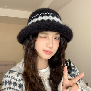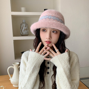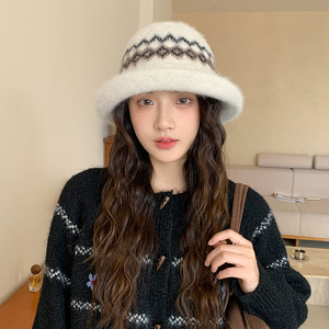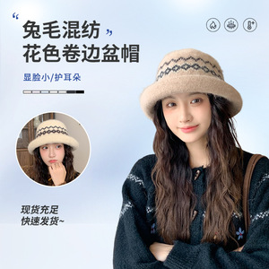 厂家批发兔毛混纺花色卷边盆帽加绒加厚秋冬季新款针织卷边盆帽