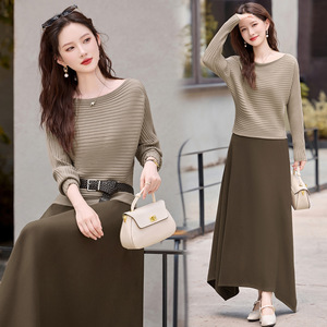 套装2025秋季新款女简约圆领长袖T恤衫半裙两件套裙 配腰带 XM906