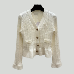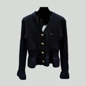 新款上市~小香风个性设计金属纽扣拼接logo车章折叠感V领针织开衫