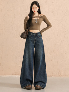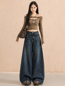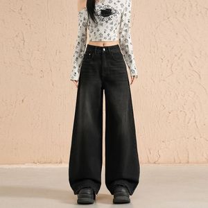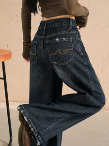 刺绣复古牛仔裤女2025秋冬新宽高腰显瘦宽松阔腿慵懒风直筒拖地裤