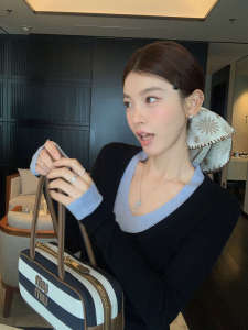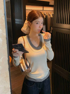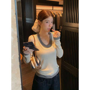 拼接撞色假两件上衣女春秋季chic轻奢休闲显瘦内搭打底针织衫毛衣