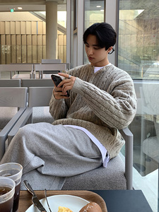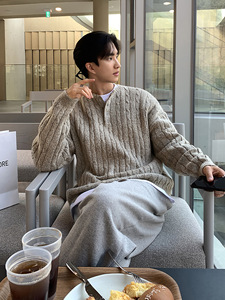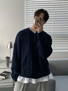 ASCLO极简亨利领麻花套头毛衣男秋冬慵懒保暖穿搭韩版宽松针织衫