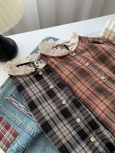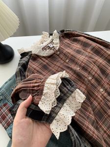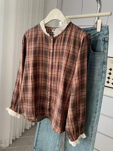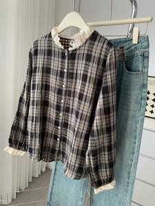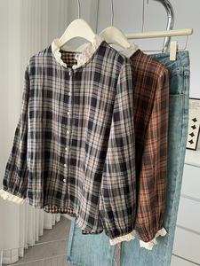 格子衬衫女2025新款早秋复古文艺宽松休闲花边领纯棉长袖打底衬衣