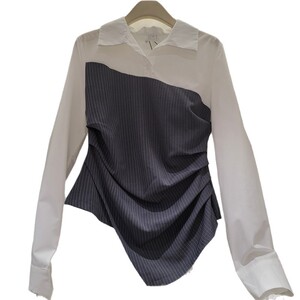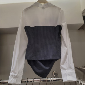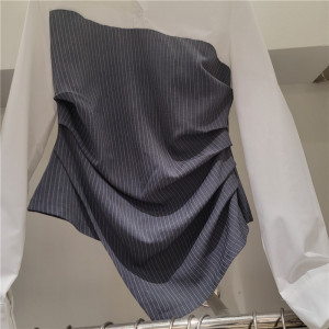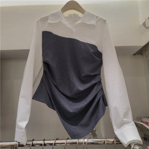 不规则条纹抹胸拼接衬衫女韩国翻领褶皱收腰气质百搭假两件上衣潮
