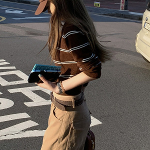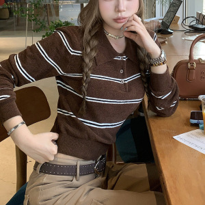 布朗可可 棕色条纹针织polo衫女早秋撞色长袖上衣
