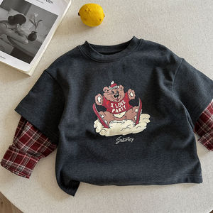 儿童韩版红格袖假两件T恤2025年男童卡通棉卫衣秋季新款打底衫t