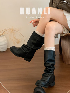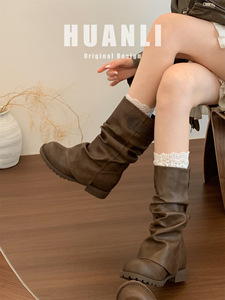 牛皮版~复古辣妹机车靴女秋冬褶皱堆堆靴粗跟中筒裤管靴骑士靴子