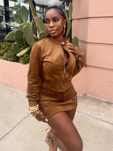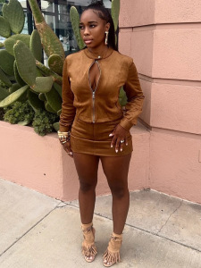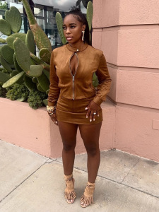2025秋欧美新款跨境热卖女装拉链圆领开衫上衣纯色包臀短裤套装女
