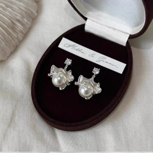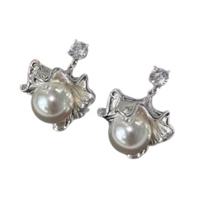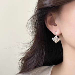 新款灰色扇形银杏叶珍珠耳环女轻奢高级感气质小众独特设计耳饰潮