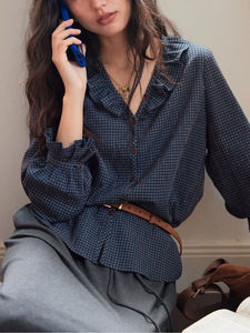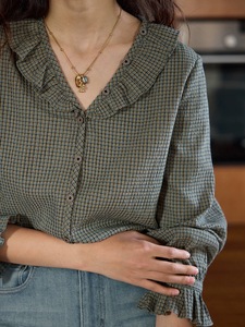 【9/8 零点新品9折】solighter 法式复古V领荷叶边格子衬衫女秋季