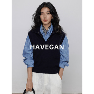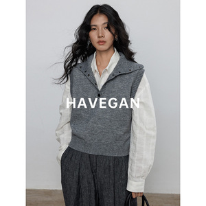 与间HAVEGAN/秋季翻领无袖针织马甲女软糯外穿毛衣背心慵懒上衣