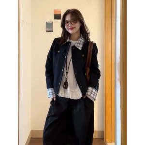 复古格纹拼接外套女秋季2025新款设计感休闲短款小个子夹克上衣潮