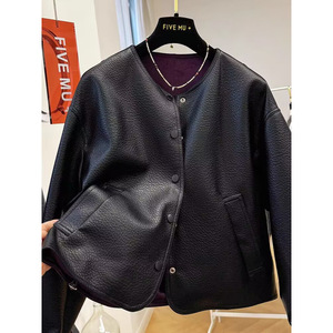 高级感超好看别致圆领短款小皮衣外套女秋冬款复古荔枝纹pu皮夹克