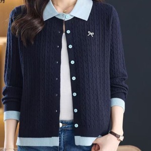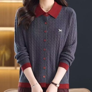 设计感欧货翻领撞色针织开衫女2025早秋冬小个子毛衣外套宽松上衣