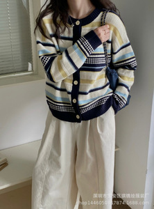 琪镌绘制彩色条纹针织毛衣女秋季新款慵懒风宽松开衫上衣外套9608