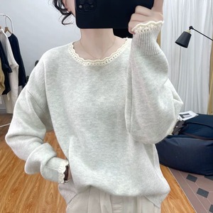 花边领圆领套头针织衫秋冬新款大码胖mm宽松上衣减龄百搭打底毛衣