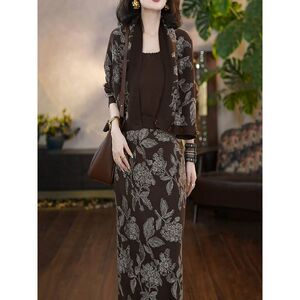 时尚休闲风撞色拼接针织裙套装秋季新款长袖百搭上衣+半身裙8394