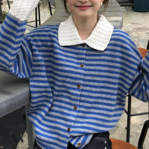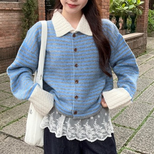 2025秋季新款复古撞色条纹女式毛衣休闲Polo领针织开衫上衣百搭款