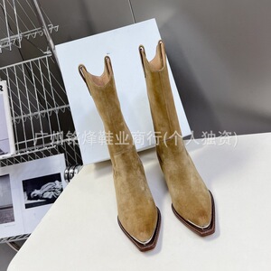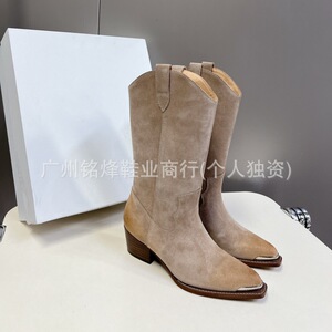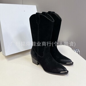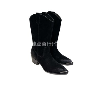 高版小众新款麂皮金属铁头西部牛仔靴复古做旧擦色尖头粗跟中筒靴