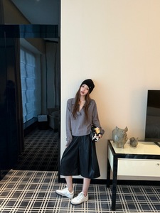 灰色polo长袖上衣针织衫美式七分阔腿休闲皮裤女2025秋季新款套装