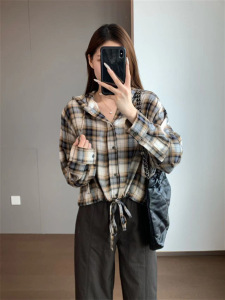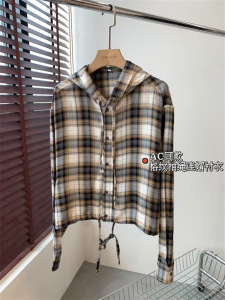 AC同款 复古佰搭宽松版翻领落肩长袖底边抽绳格纹连帽衬衣