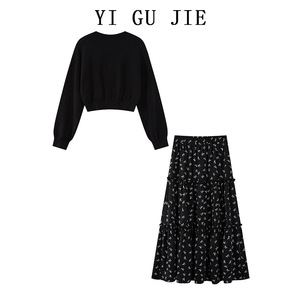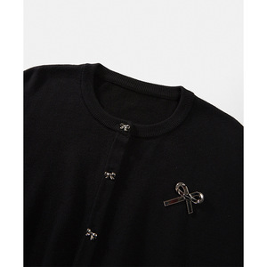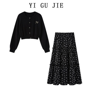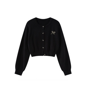 黑色圆领蝴蝶结长袖针织开衫女秋季新款短款上衣搭气质显瘦半身裙