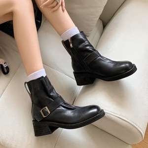 2025新款 牛皮圆头厚底机车靴女 5.5cm粗跟皮带扣帅气短靴黑/棕色