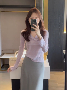 紫色翻领针织衫女秋季长袖修身内搭竹节纹打底衫气质感T恤ins2025