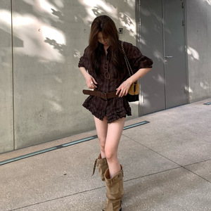 美式辣妹复古咖色格子衬衫气质长袖衬衣女秋季设计感开衫外套上衣