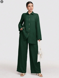穆斯林中东纯色简约2件套 女装前纽扣长袖休闲衬衫+ 直筒裤套装