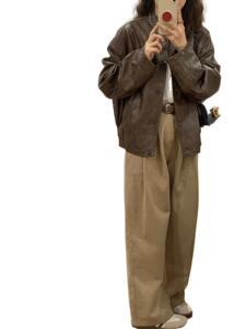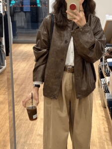 小众立领皮衣外套女美式复古黄棕百搭秋季设计感休闲宽松外搭上衣