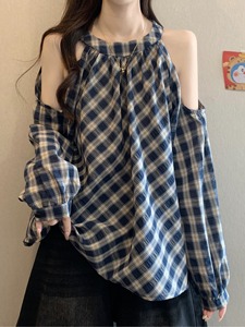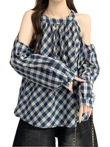 秋装2025新款法式格子衬衫女宽松慵懒显瘦露肩长袖上衣娃娃衫百搭