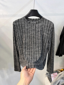 欧洲站2025秋季圆领垫肩欧美风竖条纹理撞色宽松软糯百搭长袖T恤