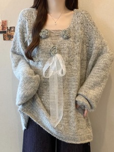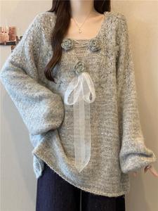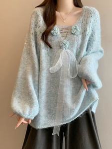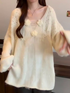 超好看立体花朵V领正肩长袖针织衫女2025秋装大码胖mm中长款上衣