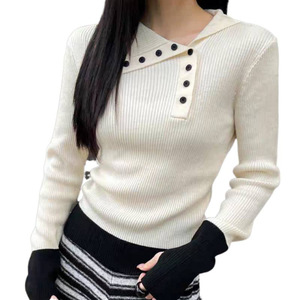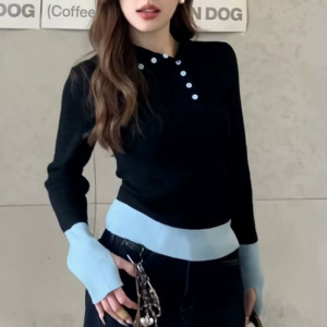 法式独特撞色纽扣长袖针织衫女秋冬内搭毛衣打底衫设计感小众上衣