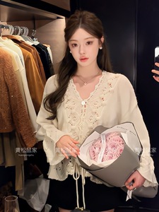 2025法式氛围感钩花镂空针织衫上衣女白色抽绳V领羊毛毛衣初秋