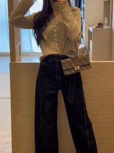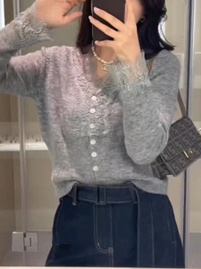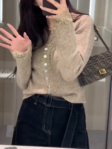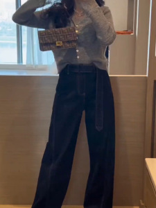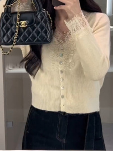 2025秋季慵懒蕾丝拼接气质毛衣长袖+复古高腰韩版腰带水洗牛仔裤