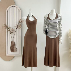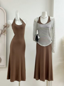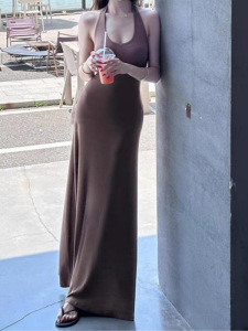 露思同款 挂脖气质修身紧身包臀裙子露背连衣裙长裙