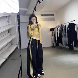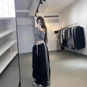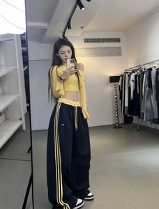 美式复古三条杠运动裤女2025秋冬款高腰抽绳显瘦运动阔腿裤子女